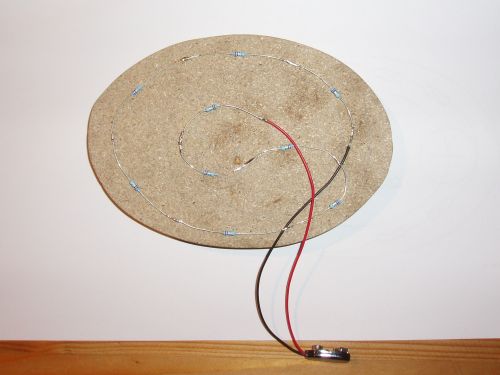 FS - Heizung Geheizt wird über 9 gleichmäßig auf den FS verteilte Widerstände (0,62 Ohm). Diese sind nur mit Isolierband fixiert und können dadurch nach oben nur wenig Wärme verlieren. Insgesamt liegt eine Heizleistung von etwa 1 Watt an. Gespeist wird diese durch zwei 1,5 V Batterien, die im Fall der Fälle in ein Batteriekäfig angebracht werden können. Dieser ist mit Klettband innerhalb des FS - Halterrohrs fixiert. Auf Schalter oder Temperaturfühler wurde verzichtet. |