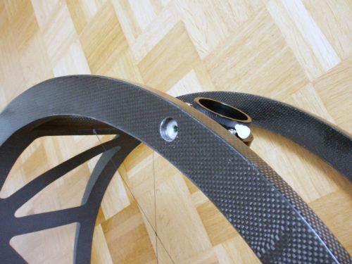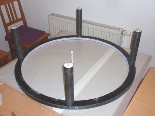 CFK - Hutgestell Das Gerüst besteht aus zwei 22mm starken Ringen mit einer Breite von 45mm. Als Sandwichkern wurde handelsübliches Styrodur (OBI) gewählt, welches sich recht einfach mit Oberfräse oder heißem Draht in Form bringen lässt. Darauf wurden an den Stirnseiten jeweils 2 Lagen 160g/m² CFK Lagen aufgeklebt (laminiert), alles auf einfachste Weise als Handlaminat ohne Temperung und Vakuum. Nach dem Schleifen (Vorsicht, Mundschutz tragen!) wurde das CFK außen mit Klarlack und innen mit schwarzer Antireflexfarbe versehen. Mit ein wenig Übung und Einarbeitung können solche z.B. Sandwichgerüste problemlos selbst hergestellt werden. Ein schnelldrehendes Multifunktionswerkzeug (Dremel) hat sich als Werkzeug sehr bewährt. Als Verbindung der Ringe wurden günstig erstandenen 40mm CFK Rohre verwendet. Diese ergeben mit den beiden Sandwichringen eine gesamte Huthöhe von 29cm. Als Innenverkleidung wurde ebenfalls CFK gewählt und mit einer bzw. zwei Lagen realisiert. Diese wurden auf einer gebogenen Form laminiert und so für das einlaminieren in das Hutgestell vorbereitet.