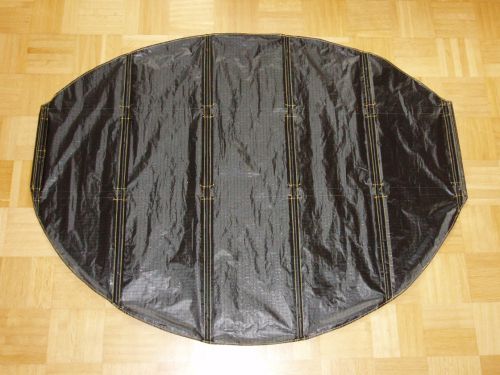 Gegenlichtblende Die Größe der Gegenlichtblende wurde grob durch den Blick des OAZ ermittelt und großzügig dimensioniert. Im Prinzip darf kein Streulicht außerhalb des FS in den OAZ gelangen. Die etwa 100cm x 130cm messende Gegenlichtblende ist aus leichtem Drachenstoff (einlagig) genäht. Gestützt wird die Blende durch sechs vertikal eingenähte CFK Rohre (4mm). Insgesamt wiegt die Blende 160g. Befestigt wird sie mittels auf den Hut verklebten Kabelclips, die an die CFK Rohre greifen und diese so halten. Die Blende ist zwar durch die eine Lage Drachestoff nicht komplett undurchsichtig, dunkelt den Hintergrund aber ausreichend ab. Vorteil ist die wasserabweisende Wirkung des folienähnlichen Stoffes. Falls das Teleskop gerade nicht in Benutzung ist, wird die Blende als Segel für ein Ruderboot genutzt. |