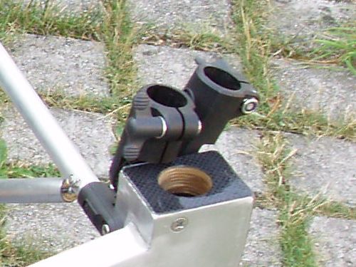 Stangenbefestigungen Um den Stangen weder die Möglichkeit zum Verdrehen, noch zum Verkippen zu geben, sind diese eng in einem U-Profil aus Alu eingefasst. Darüber bewegt sich eine Aluschraube mit aufgeklebter und ausgebohrter Alurändelscheibe, die in die im Hut eingelassenen Innengewinde greift. Um Gewicht am richtigen Platz zu