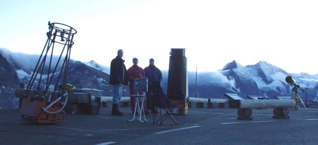 So geht die Nacht mit weiteren VIP's wie B 33, M 76, NGC 6888, NGC 1981, M 42/43 und dem Cirrusnebel zu Ende. Wir beschließen uns Zeit bei Abbau der Gerätschaften zu lassen und uns den Sonnenaufgang zu gönnen. Die Dämmerungsfarben beobachten wir vom Turm der Edelweißspitze. Rötliche, violette bis blaue Farbtöne verschmelzen in einem sagenhaft schönen Ton mit Kontrast zu den pechschwarzen Bergspitzen der Hohen Tauern. Im Osten geht die Venus auf und kündigt den zeitlich nahen Sonnenaufgang an. Kurz vor Sonnenaufgang fangen dann die Ostseiten der Berge an rötlich zu "glühen", ein einmaliger Anblick. Die ersten Sonnenstrahlen erinnern uns daran, dass das Frühstück auf uns wartet, wir brechen wieder Richtung Wallackhaus auf.