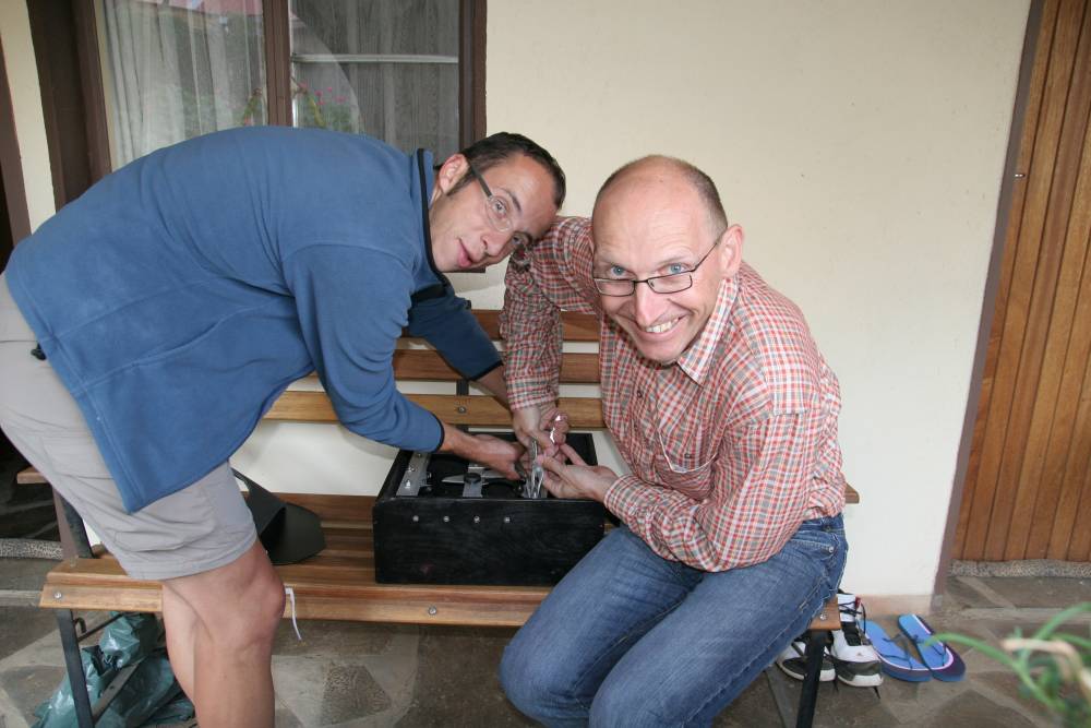 Weitere, uns endlos vorkommende Kilometer, meist auf Schotterpisten, genannt "Pads" biegen wir nach etwa 2,5 Stunden Fahrt von der Hauptpad ab. Ein Schild "Hakos 7km" weist uns den Weg. Nach weiteren Minuten holpriger Fahrt erblicken wir endlich das Ziel - das auf einer Anhöhe gelegene Farmhaus. Das Auspacken geschieht schnell, sodass wir unserer Zimmer in dem älteren, aber voll intakten und sauberen Gebäudetrakt des groß und verschachtelt gebauten Farmgebäudes beziehen können. Nach dem Motto, "erst die Maschine, dann der Mensch" bauen wir zunächst unsere Geräte auf. Amtshandlung Nummer 1 ist diese vom Staub der Fahrt zu befreien. Es ist leider immer noch bewölkt, wir sind aber zuversichtlich und stecken voller Tatendrang.