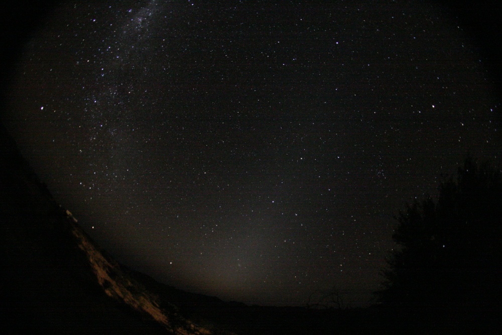 Nach dem Abendessen sind die meisten Wolken verschwunden. Das Kegel des Zodiakallichtes ist bis über dem Zenit zu verfolgen. Ansatzweise ist auch das Zodiakallband komplett zu sehen. Leider kümmere ich mich zu wenig um diesen so interessante Erscheinung.