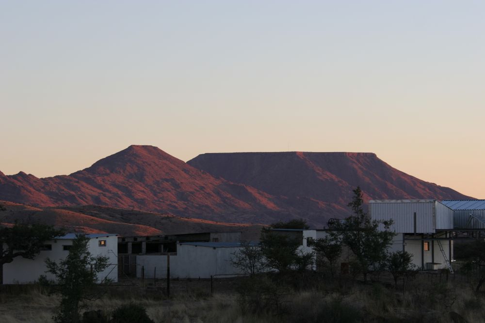 Gamsberg im Abendlicht, davor ehemalige Schweineställe und IAS Sternwarte
