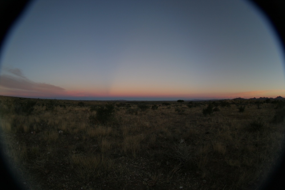 Erfreulich für uns ist die Wolkenentwicklung. Die Zirren vom Morgen verzogen sich im Laufe des Tages vollständig. Friedl und ich begeben uns auf eine Anhöhe, um unser letzten abendlichen Erdschatten zu sehen. Oben ist es wieder einmal absolut still - eine tolle Stimmung umgibt uns. Nach Sonnenuntergang und während der Erdschattenentwicklung fallen uns wie schon an den vorigen Tagen rötliche Streifen am Himmel auf, die wir zunächst als hohe Zirren deuten. Grund der Färbung liegt aber wohl eher an der Asche, die nach dem Ausbruch des russischen Sarychev-Vulkans in der Atmosphäre verteilt wurde.