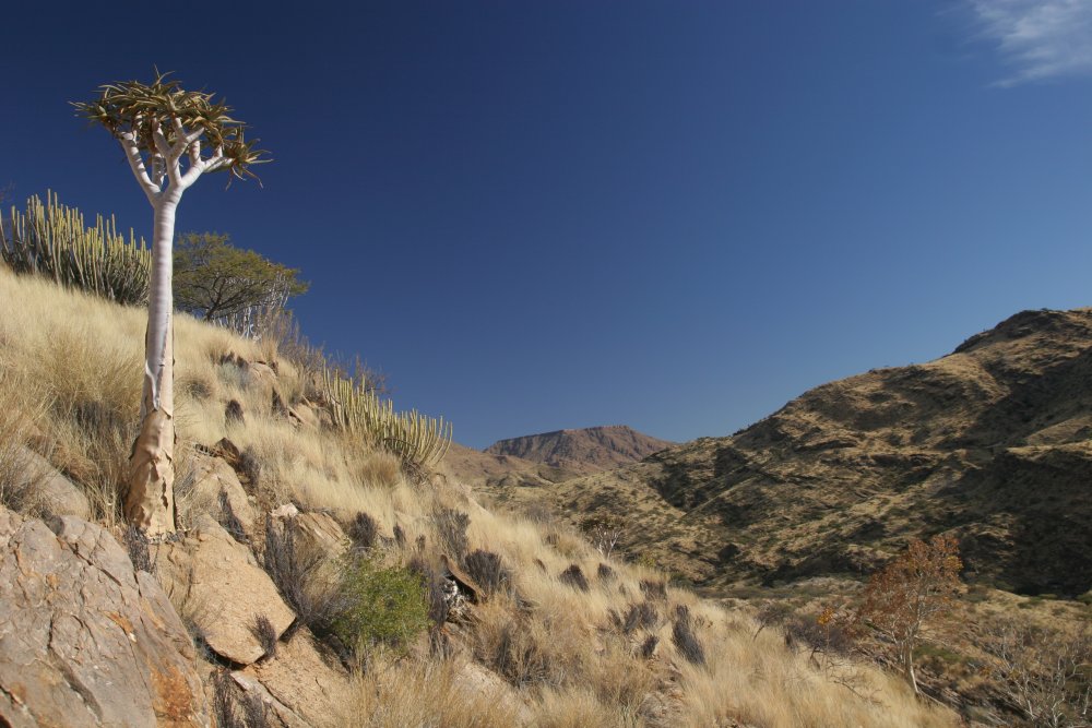 Nach gut einer halben Stunde spektakulärer Fahrt kommen wir (Fahrer + Auto + Insassen) heil in einer Art Tal an. Während der Fahrt konnten wir bereits erste Köcherbäume erkennen. Friedhelm stellt das Auto ab, wir steigen ab, aber immer noch kein Anzeichen eines Waldes. Dieser entpuppt sich für Naturunkundige wie mich als zugänglich gemachter Bergrücken, an dem einzelne Köcherbäume stehen. Wir gehen zunächst steil auf einem kleinen Pfad bergan. Bald zeigen sich die ersten Bäume.