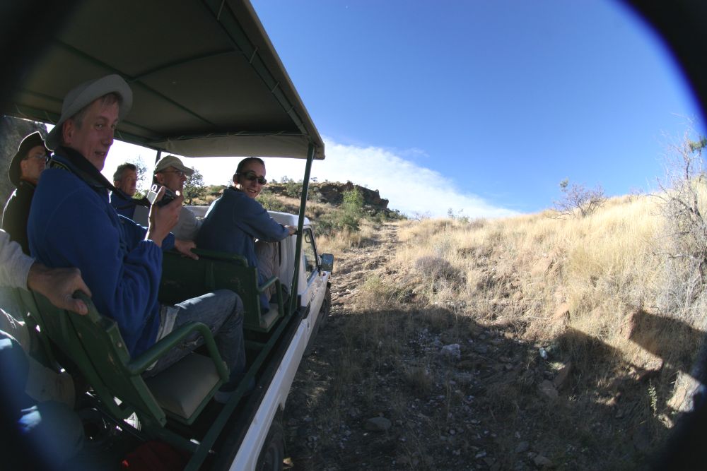 Unsere volle Konzentration liegt in dem geplanten Ausflug zum Köcherbaumwald. Starten tun wir am frühen Nachmittag. Unvorbereitet erwarte ich aus dem Namen abgeleitet ein Wald aus Köcherbäumen. Doch der für mich eigentlich spektakuläre und vollkommen unerwartete Teil überrascht uns alle. Der Köcherbauwald liegt noch auf dem Farmgelände. Wir fahren daher zunächst auf die "Hauptstraße", dem gut geschotterten Pad, überqueren den Gamsbergpass unweit der Einbiegung zur Hakos Farm und fahren danach noch wenige Kilometer bergab. Dann biegt Friedhelm plötzlich links ab, wir sehen aber weder einen Pad noch irgendwelche wie Wege aussehenden Strecken - das Abendteuer beginnt. Die Untersetzung und alle zur Verfügung stehenden Sperren werden eingelegt, es geht ins Nichts und das Nichts ist verdammt steil. Wir fahren mit Schritttempo in der Wildnis, über Felsen und Buschwerk. Der "Weg" ist nur angedeutet. Wir haben alle Hände voll zu tun uns an den offenen "Sitzkasten" der auf den Jeep montiert ist festzuhalten. Fotografieren ist nur unter der Gefahr des Kameraverlustes möglich - einige von uns versuchen es trotzdem, aber die Kameras überleben es vollzählig. Ich erinnere mich jetzt plötzlich an Rudis Worte "...blaue Flecke...schweres Gelände", hatte aber seinerzeit die Warnung verdrängt, da mir wohl die Verknüpfung der Worten "schweres Gelände" und "Köcherbaumwald" nicht gelang.