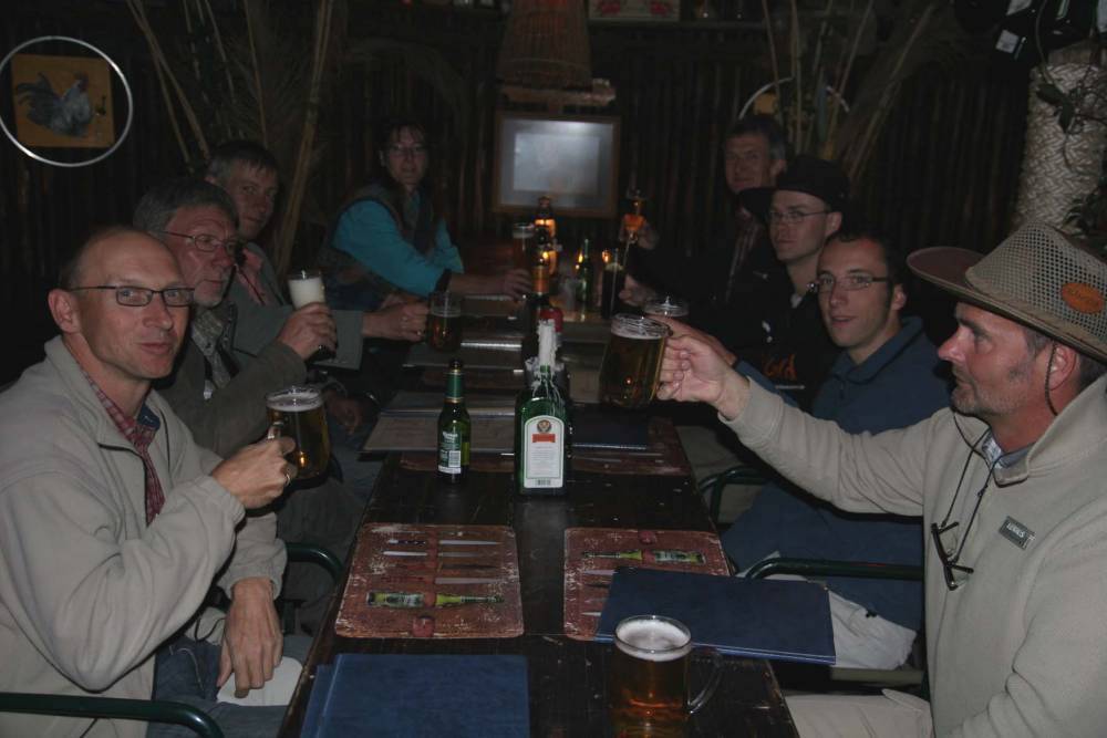 Doch das Highlight kommt noch. Wir begeben uns zu der in Windhuk bekannten "Joes Bar". Ein traumhaft angelegtes Ensemble von benachbarten Lokalen. Das typisch namibianische Lokal lässt sich nur wenig mit Deutschen vergleichen. Unser Lokal ist rund und nach oben hin offen um eine Feuerstelle angelegt. An den Außenseiten kann man sitzen. An einer Stelle ist der Zugang zur Küche, aus der das rege Treiben gut zu beobachten ist. Spezialität ist hier das Gegrillte. Der trockenen Luft fallen wir aber schnell zum Opfer, die erste Bierrunde ist bestellt. Neben einheimischen Windhuk - Lager ist auch Erdinger und Schöfferhofer Weizen zu bekommen. Wir fühlen uns wohl. Als Essen entscheide ich mich für Gemsbock. Meine Entscheidung sollte ich nicht bereuen, das Fleisch ist einfach nur ein Traum. Im Laufe des Abends wird es kühler, wir rücken der Feuerstelle immer näher, eine geniale Sache. Über uns ist das Kreuz des Südens zu sehen, sogar die hellsten Milchstraßenabschnitte sind zu erkennen.