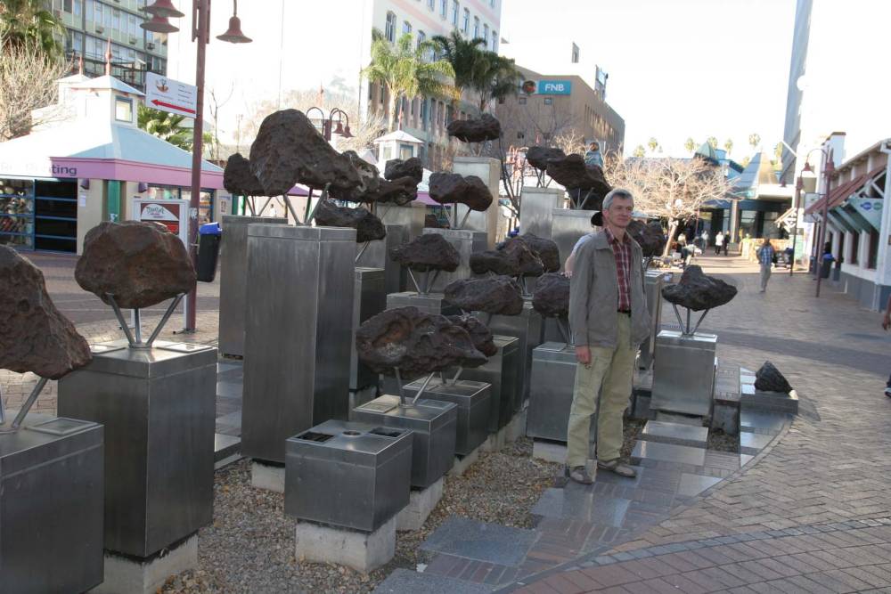 Der Besuch in Windhuk verläuft für mich enttäuschend. Die Sehenswürdigkeiten lassen sich an einer Hand abzählen. Windhuk fehlt es an einer gewachsenen Kernstadt. Der Abriss historischer Gebäude und der Bau möglichst schlecht angepasster Plattenbauten wird hier wohl unbürokratischer gehandhabt als in deutschen Landen, ein Lob auf das Bauamt und den Denkmalschutz. Zu bedenken ist natürlich, dass Windhuk als Stadt erst etwa 120 Jahre existiert. Wir stürzen uns zunächst auf die bekannten Gibeon - Eisenmeteoriten in der Innenstadt. Drei von ihnen sind bereits gewaltsam entfernt worden. Der Plan einen Kaffee zu trinken oder ein afrikanisches Eis zu genießen fällt aus, wir finden am Sonntag kein offenes Kaffee. Wir laufen zur alten Christuskirche, die von Palmen umgeben in einem ungewohnten Kontrast unter blauen afrikanischen Himmel beleuchtet wird. Gleich daneben befindet sich die Statue des "Südwester Reiter" und die alte, von deutschen gegründete Feste. Sofort werden wir von gut deutsch sprechenden Schwarzen umgeben, die von uns "Spenden" haben möchten. Dabei liegen unsere finanziellen Werte hinter einem mit Strom gesicherten Zaun, meist in silbernen Alukoffern - mehr oder weniger staubsicher verpackt. Auf den Rückweg fallen mir diverse Straßennamen auf, neben "Kaiser Wilhelm" existieren auch "Fidel Castro" und "Robert Mugave" in gleichnamigen Straßen oder Avenuen. Am Treffpunkt versammeln wir uns alle bereits vor der vereinbarten Zeit.