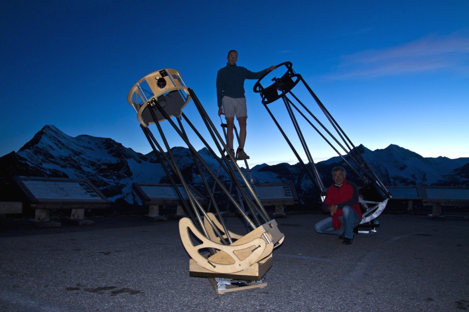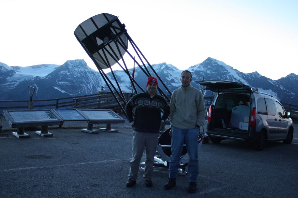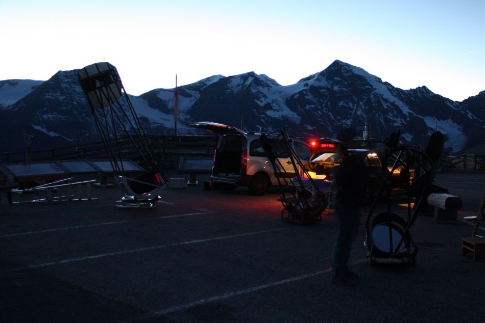 Doch die Wetterprognosen für den Oktoberneumond drehten pünktlich auf eine stabile Hochdrucklage. Schnell sprach sich das unter den "üblichen Verdächtigen" herum, sodass zwei Gruppen in Richtung Bieler Höhe und Großglockner Hochalpenstraße aufbrachen. Ich entschied mich für letzteres, da ich vom Beobachtungsprogramm auf gutes Seeing setzte, was tendenziell eher für die von störenden Luftströmungen laminar umströmte Edelweißspitze spricht. So traf ich am Freitag den 8. Oktober gegen Nachmittag am Platz ein. Schon vor Ort war Gerrit Hammersen - Friedl Lamprecht, Marc Emde - Deckname "Mr Equipment", Walter Koprolin und Martin Brückner stießen später nach.
