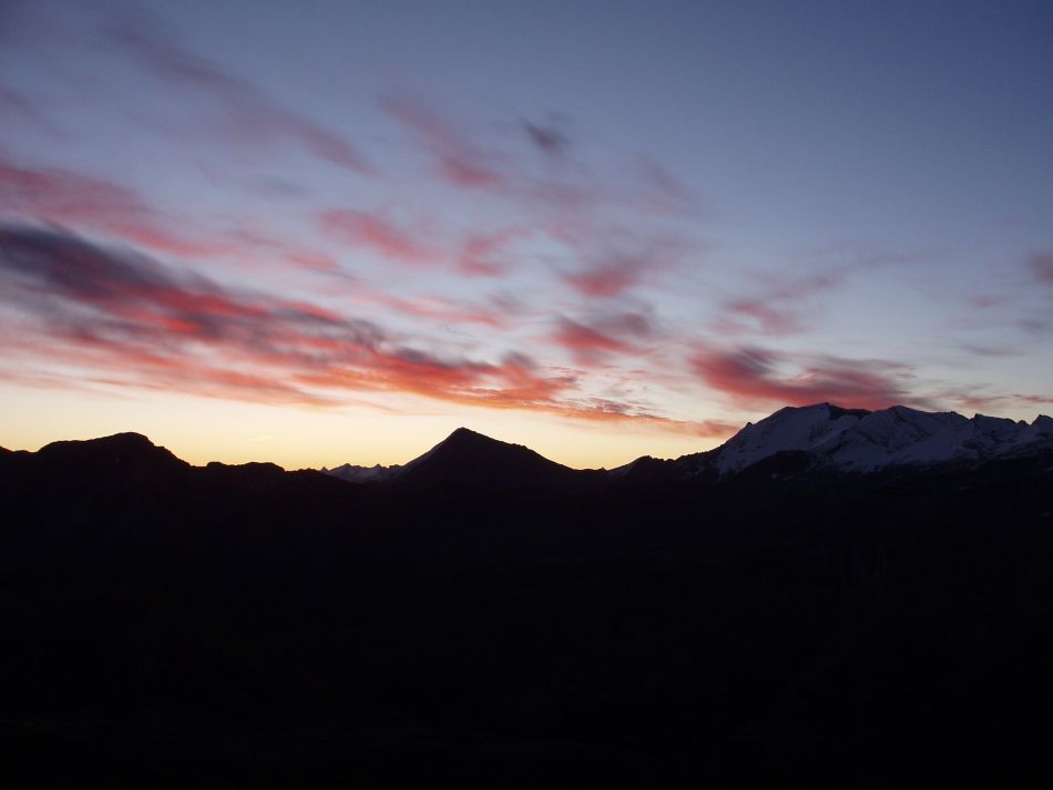 Die Nacht geht zu Ende. Wir bauen wie gewohnt im fahlen Licht ab. Die Dämmerung schreitet schnell voran. Wir begeben uns nach getaner Arbeit mit einem Bier auf den Aussichtsturm und beobachten die wechselnden Dämmerungsfarben. Zufrieden stoßen wir auf eine äußerst gelungenen Nacht an. Am gegenüber befindlichen Großen Wiesbachhorn (3564m) fangen die Spitzen an sich rot zu färben. Bald darauf leuchtet das komplette Bergmassiv in rötlichen Tönen ... nur noch wenige Minuten, bevor auch wir die ersten Sonnenstrahlen erhaschen können. Nachdem wir diese ein paar Minuten genießen, gehen wir zum Frühstück über und tanken danach Energie für die nächste bevorstehende Nacht.