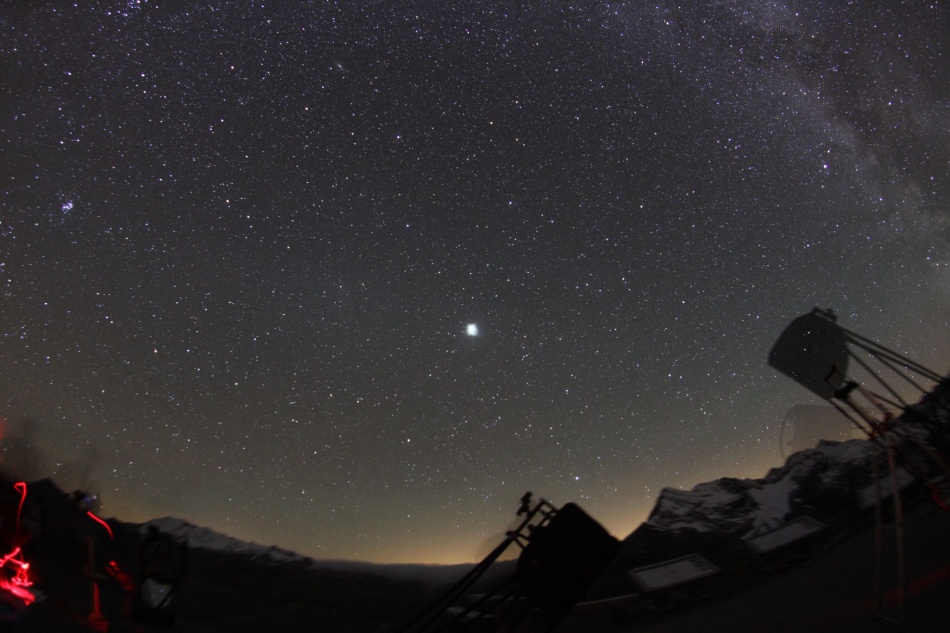 Der Monduntergang fällt auf eine Stunde nach Dämmerungsende. Wir entscheiden trotzdem früh genug aufzubauen und die Zeit bis zu völligen Dunkelheit abzuwarten. Diese Entscheidung stellt sich als richtig heraus - der Platz erstrahlt in einem fahlen, vollkommen ungewohnten Licht. Trotz bereits fortgeschrittener Mondphase zeigt sich die Milchstraße hell und strukturiert. Gerrit und Costa zeigen einer neugierigen Familie ein paar Highlights am Himmel ... es kommt die Frage auf, warum wir solche Strapazen auf uns nehmen und die Sterne gerade von hier aus beobachten. Gerrit fragt zurück ob sie die Nationalflagge der Ostfriesen kennen - weißer Adler auf weißem Grund - und erklärt unter heftigen Lachanfällen unsere Situation und die Wirkung eines aufgehellten Himmels. Kurz nach 21.00 verschwindet der Mond hinter den 3000'ern - es wird schlagartig dunkel, wir starten in die Nacht.