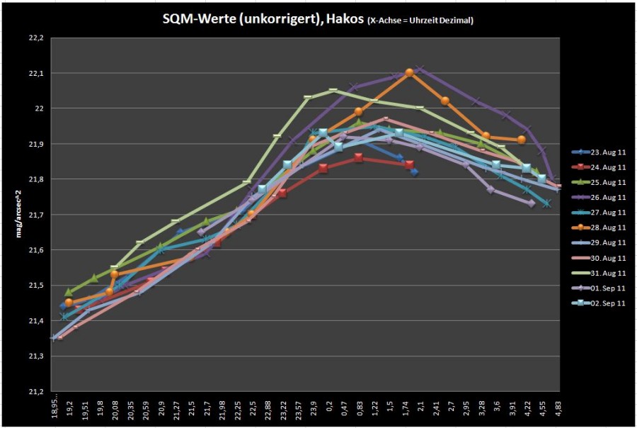 Obwohl in den Stundenbereichen um 1.00h die sichtbare Milchstraße nur unwesentlich über den Horizont steigt, sind Minderungen der Werte klar feststellbar. Die Erklärung dafür könnte zum einen darin begründet sein, dass das SQM ohne Linse einen relativ breiten Öffnungswinkel aufweist und somit auch sehr tiefe Bereiche über den Horizont erfasst werden, sowie zum zweiten, dass die durch das SQM registrierbare Milchstraße deutlich breiter ist, als es das menschliche Auge wahrnehmen kann.
