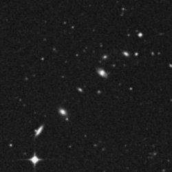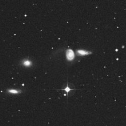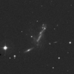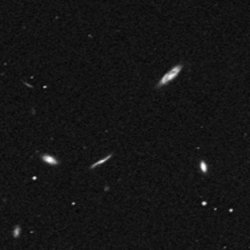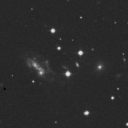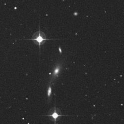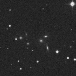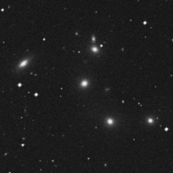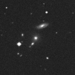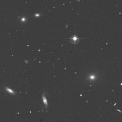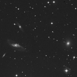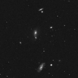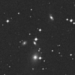 7m+ Interessante, wenn auch schwierige Gruppe; wird durch ein etwa 1,5' langes, schmales und zusammenhängendes Galaxienknäul gebildet, welches visuell wie ein schwacher Strich aussieht und Ähnlichkeiten mit einer Superthin Galaxie aufweist; a verschmilzt dabei mit g und ist als mittige Aufhellung des Strichs gut und sicher indirekt auszumachen; b sitzt als ebenfalls indirekt leicht nachzuvollziehender Spot am NO Ende des Strichs; c ist von a gut 1,5' W und vom zentrale Strich etwas abgesetzt bzw. nicht verbunden, flächenhell aber kleine Galaxie 3:2 NW-SO elongiert; d sitzt wenige Bogensekunden NW fast direkt auf b, kann aber getrennt werden und wirkt wie eine Art enger Doppelstern; e sitzt ebenfalls abgesetzt etwa 1,5' SW von a und kann mit 18 bmag im 27" knapp indirekt gehalten werden, jedoch ohne Elongationsrichtung; f nicht zu sehen Zeichnung |