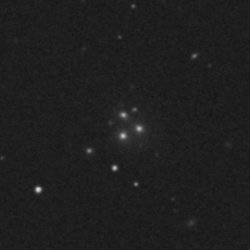 6m+ Zunächst ist mit a das hellste Mitglied der Gruppe leicht indirekt auszumachen; a ist dabei 1:2 SO-NW elongiert und weist ein leicht helleren Zentralbereich aus; die ähnlich hell wirkenden b, c und d sind schwächer als a, aber noch problemlos indirekt als runde, flächige Objekte zu halten; e noch schwächer als b, c, d, rund, flächig und indirekt ständig zu halten; f ist mit Abstand schwierigste Galaxie der Gruppe; zunächst ist 25" NW von d ein schwacher 15mag Stern zu sehen; im gleichschenkligen Dreieck Richtung NO blitzt dann f 34" N von d immer wieder als leicht flächiges Objekt durch; f ist dabei schwieriger als der Stern selbst und indirekt nicht ständig zu halten Zeichnung |