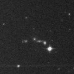 7m+ Anspruchsvolle 2,5' lange Galaxienkette aus 5 Einzelgalaxien; zunächst sind a und b als kleine, flächige Aufhellungen direkt zu sehen; b hängt dabei direkt S eines 11mag Sterns; c ist dann deutlich schwacher als a ca. 0,5' W zu sehen und kann als flächige Aufhellung knapp indirekt gehalten werden; d und e tauchen indirekt als stellare Aufhellungen wiederholt an der Wahrnehmungsgrenze auf und können indirekt nicht gehalten werden Zeichnung |
