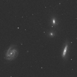 6m5+ Schwere Gruppe für 8" Öffnung; a bereits als auffälliger, heller Fleck als einzige Galaxie in der Übersichtsvergrößerung zu erkennen, bei höherer Vergrößerung wirkt diese konzentriert und leicht NO-SW elongiert; b indirekt immer wieder als schwache Aufhellung aufblitzend, aber nicht zu halten; an der Stelle von Doppelsystem d/e immer nur eine Galaxie knapp zu halten - Position passt trotz geringerer Absolut- und Flächenhelligkeit besser zu e; c nicht gesehen